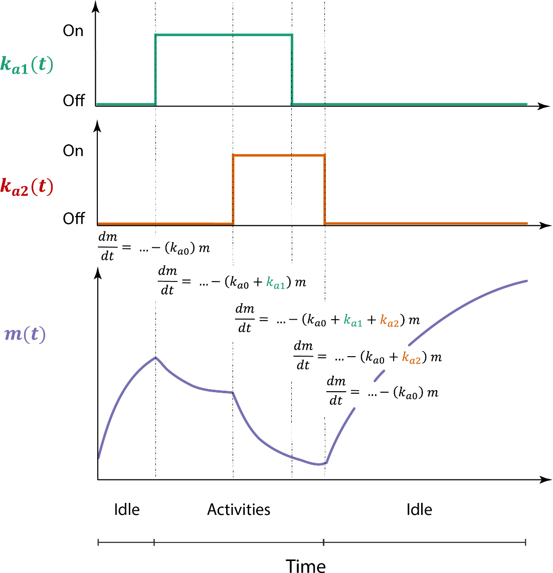 Figure 2. Overview of ABICAM's treatment of time-dependent parameters. Here, \(k_{a0}\) corresponds to a baseline removal rate coefficient \([\mathrm{T^{-1}}]\) for an arbitrary compartment, while \(k_{a1}\) and \(k_{a2}\) are time-dependent removal rate coefficients for two arbitrary activities (a1, a2). These latter two parameters are portrayed as being disabled or enabled as a function of time, depending on which activities are occurring. The total removal rate at time \(t\) governs the dynamics of contaminant mass, expressed as \(m(t)\), in this compartment.