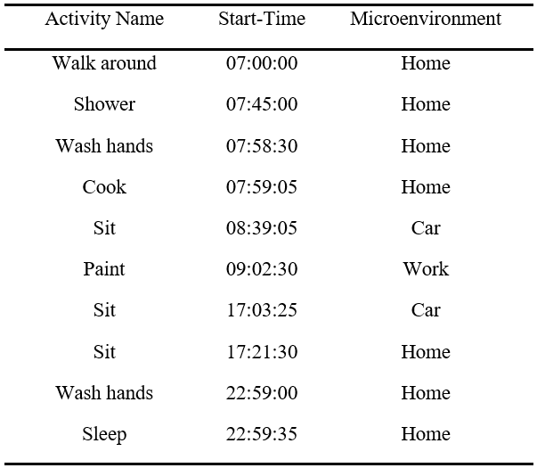 An activity schedule maps a given human occupant's activities to specific time periods. Accordingly, this schedule determines which microenvironment they should reside in, and which activity to perform throughout each period. ABICAM combines the individual schedules of all occupants into a master schedule, which governs an exposure simulation. This collection is disjoint (non-overlapping) and thereby accounts for every change in activity that must occur at the desired time resolution (e.g., minutes or seconds). The individual schedules of occupants can be independent or correlated with respect to time. Accounting for correlated activities enables occupants to interact with each other. Such interactions can include (a) performing the same activity, (b) changing their location/microenvironment simultaneously, (c) residing in the same microenvironment, and (d) cross-contaminating each other through contaminant mass exchange.