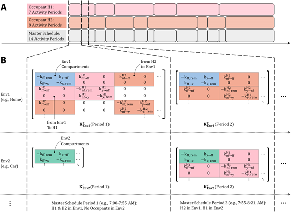 Figure 4. Overview of ABICAM's time-dependent matrices of rate coefficients for indoor microenvironments. (A) A "master schedule" maps the activities of two arbitrary human occupants (H1 and H2) to specific periods. To illustrate, each activity period is represented by a superellipse with length directly proportional to duration. (B) For a given contaminant (c), each indoor microenvironment is associated with a matrix [\(\mathrm{K}_e^c(t)\) in eqn 1]. The size of each matrix reflects the total number of compartments in the microenvironment and therefore changes as human occupants enter and leave. In this example, H1 moves from Env1 to Env2 as time progresses from Period 1 to Period 2, while H2 remains in Env1. Rate coefficients \([\mathrm{T^{-1}}]\) for contaminant mass transfer (\(\rightarrow\)) and removal (rem) are denoted by \(k\) with subscripts, nf, ff, x, and y referring to near field, far field, and arbitrary environmental and human compartments, respectively.