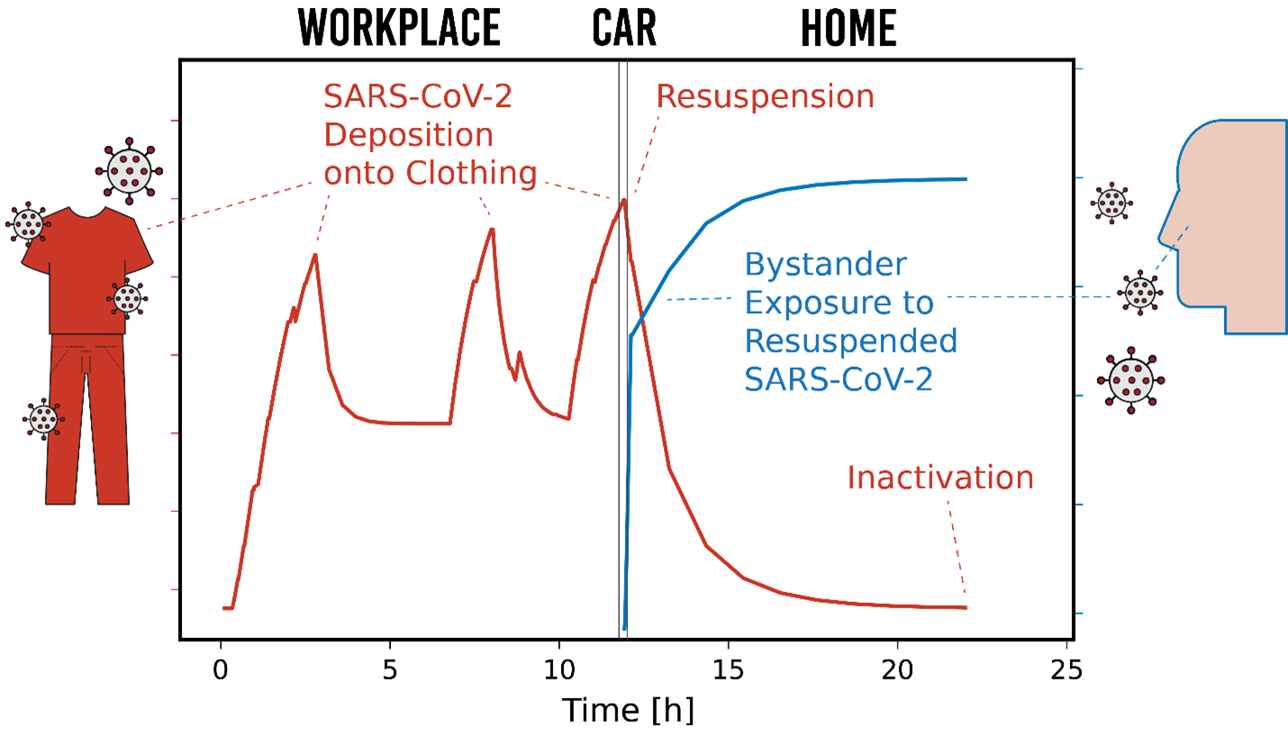 Figure 5. Example exposure histories of SARS-CoV-2 on clothing and corresponding cumulative inhalation exposure of a bystander.
